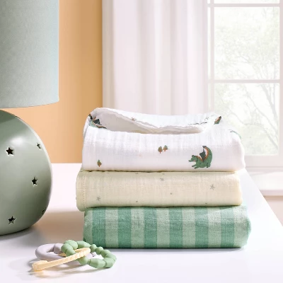 Your baby will stay comfy and cozy as they drift off to sleep with these 3-Pack Muslin Swaddle Baby Blankets from Cloud Island™. This pack includes three muslin blankets — one with an allover print, another with star print and the third with a checkered pattern. Made from 100% cotton muslin fabric, these swaddle blankets feel soft against their skin and help them stay warm while feeding, during stroller rides and beyond.